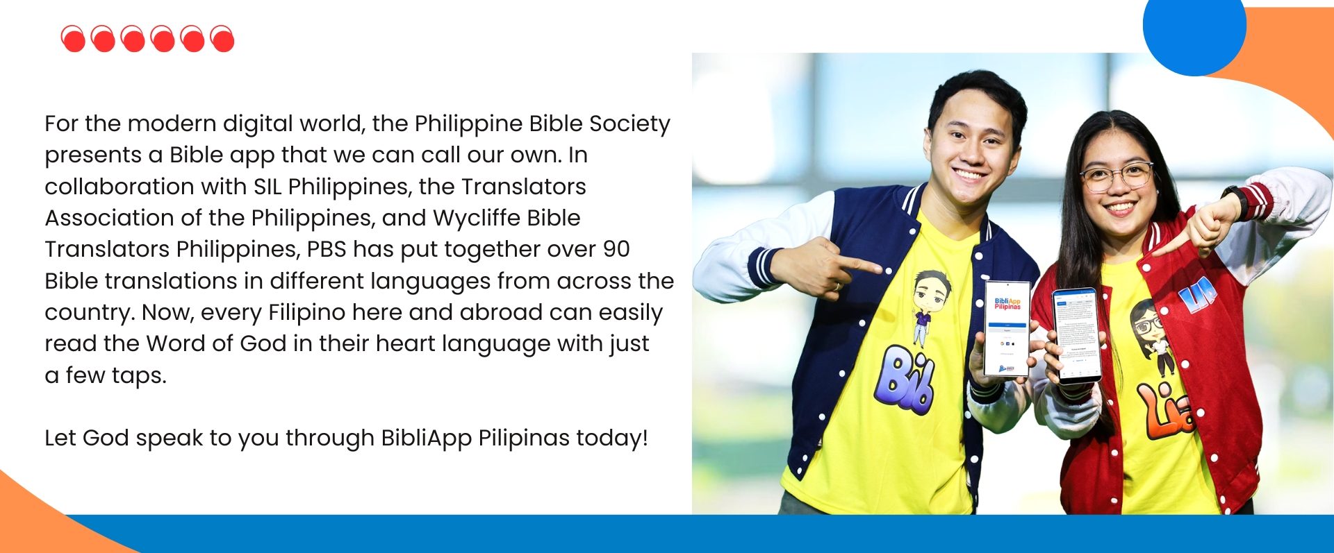 BibliApp Pilipinas aims to reach every Filipino worldwide who needs hope, strength, and guidance, as well as connect with people who can help us in making the Bible known.